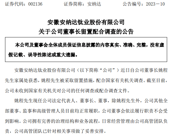 近日,安徽安納達鈦業股份有限公司(或稱公司)發布關于公司董事長留置配合調查的公告,安納達近日自公司董事長姚程先生家屬處獲悉,姚程先生被采取留置措施,配合國家有關機關調查。截至目前,公司未收到國家有關機關對公司的任何調查或配合調查文件。