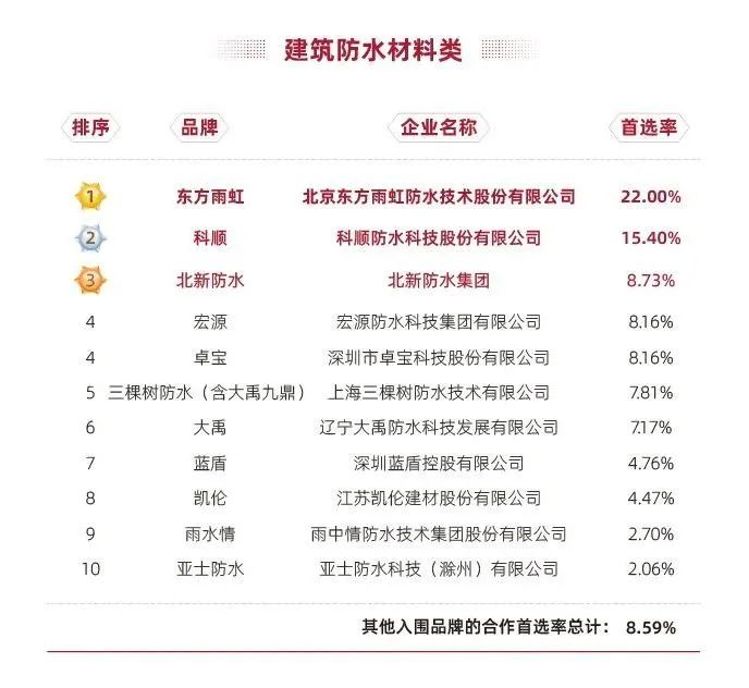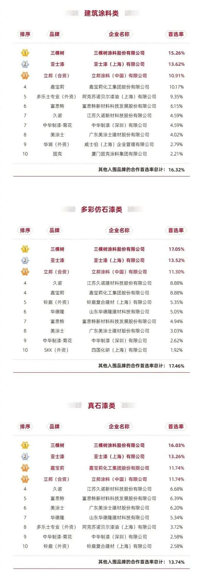憑借三棵樹綠色建筑六位一體系統的優勢,三棵樹地坪漆類居榜單首位,保溫裝飾復合板類、建筑防水材料類也榮登TOP榜單前五,為房企和消費者選用和采購誠信供應商提供具有權威價值的參考標準。