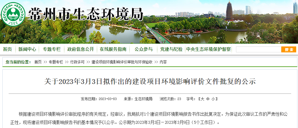 近日,江蘇省常州市生態環境局發布《關于2023年3月3日擬作出的建設項目環境影響評價文件批復的公示》,根據建設項目環境影響評價審批程序的有關規定,經審議,擬對1個建設項目環境影響報告書作出批復決定。為保證此次審議工作的嚴肅性和公正性,現將建設項目環境影響報告書的基本情況予以公示。
