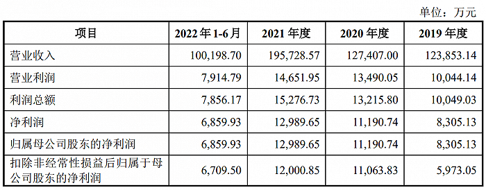 2019年、2020年、2021年、2022年1-6月,公司實現營業收入分別為12.39億元、12.74億元、19.57億元、10.02億元,同期實現歸屬于母公司股東的凈利潤分別為8,305.13萬元、1.12億元、1.3億元、6859.93萬元。