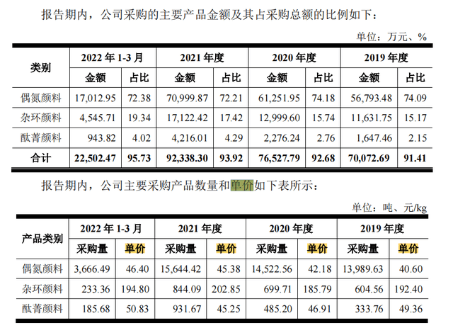 具體來看,偶氮顏料、雜環(huán)顏料是公司第一、二大業(yè)務(wù),2022年一季度, 偶氮顏料、雜環(huán)顏料及酞菁顏料等主要產(chǎn)品金額占采購總額比例分別為72.38%、19.34%、4.02%。