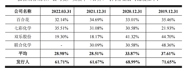 資產(chǎn)負(fù)債率方面,2019年至2022年一季度,以百合花、七彩化學(xué)、雙樂股份、聯(lián)合化學(xué)為代表的同行企業(yè)平均資產(chǎn)負(fù)債率分別為37.61%、33.87%、28.51%、28.98%,而公司報(bào)告期內(nèi)資產(chǎn)負(fù)債率分別為71.65%、68.99%、61.67%、61.71%,雖然三年來下降了9.94%,但還是遠(yuǎn)高于行業(yè)均值,而本次公司擬募集資金中的1億元將用于償還債務(wù)。