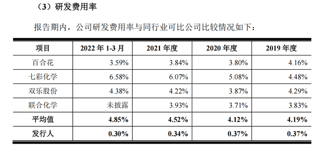 為何公司與行業(yè)研發(fā)投入的走勢背道而馳?公司表示,主要原因?yàn)楣臼且援a(chǎn)品開發(fā)、品質(zhì)管理、供應(yīng)鏈整合和全球銷售網(wǎng)絡(luò)布局為核心競爭力的著色劑專業(yè)供應(yīng)商,發(fā)行人的研發(fā)活動主要集中于產(chǎn)品開發(fā)、檢測技術(shù)的研發(fā)等,公司研發(fā)特點(diǎn)與同行業(yè)可比公司存在較大差異。