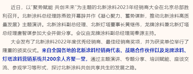 新征程時不我待,新使命催人奮進。2023年,北新涂料人將一如既往地與廣大經(jīng)銷商合作伙伴一道努力,凝心聚力、互相賦能,為中國涂料工業(yè)的發(fā)展,為中國自主高端品牌的打造努力奮斗。