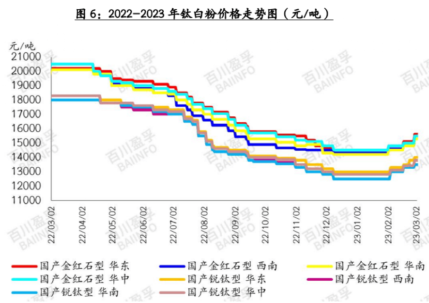 龍佰集團在3月7日透露,近期鈦白粉兩次提價后,訂單快速增長,2023年2月份的銷量近12萬噸,創歷史新高,其中出口占比約為55%。該公司同時表示,目前鈦精礦月產量為15萬噸左右,鐵精礦月產量為35萬噸左右。