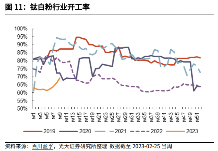 數據顯示,截至2月底,全國12220個工程項目開復工率為86.1%,周環比提升9.6個百分點,同比提升5.7個百分點。華東和華中地區開工率已超過九成,元宵過后,復工率速度有所加快。隨著宏觀經濟和房屋竣工的持續恢復,涂料開工率有望觸底回升,從而提振鈦白粉需求。而從房地產行業開復工情況來看,目前超過預期。