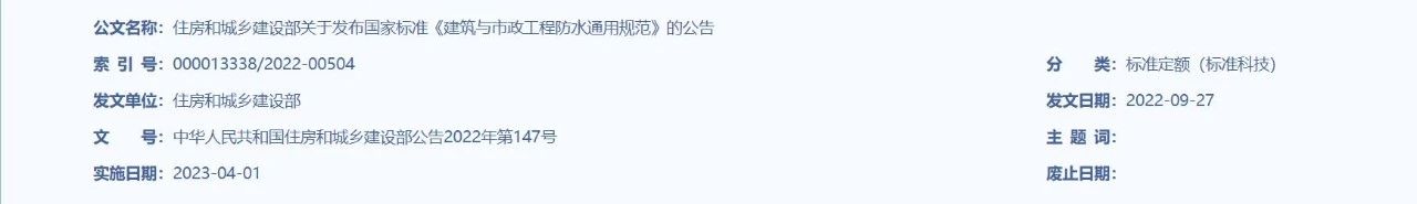 現批準《建筑與市政工程防水通用規范》為國家標準,編號為GB 55030-2022 ,自2023年4月1日起實施。本規范為強制性工程建設規范,全部條文必須嚴格執行。現行工程建設標準中有關規定與本規范不一致的,以本規范的規定為準。同時廢止下列工程建設標準相關強制性條文:
