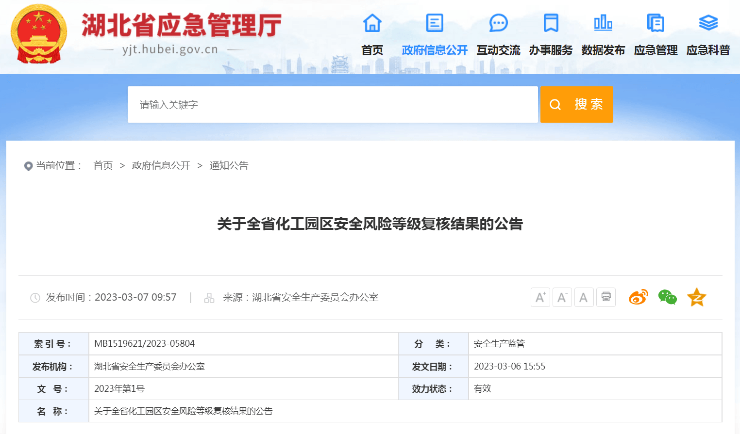 近日,湖北省應急管理廳發布關于全省化工園區安全風險等級復核結果的公告。