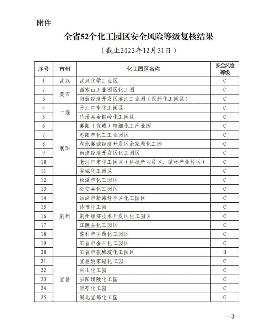 經綜合評估,確認武漢化學工業區等48個園區安全風險為C級(一般安全風險),鐘祥雙河化工行業發展園區、石首張城垸化工園區、天門高新園•生物產業園(核心區)、廣水市化工園區等4個化工園區安全風險等級為B級(較高安全風險)。
