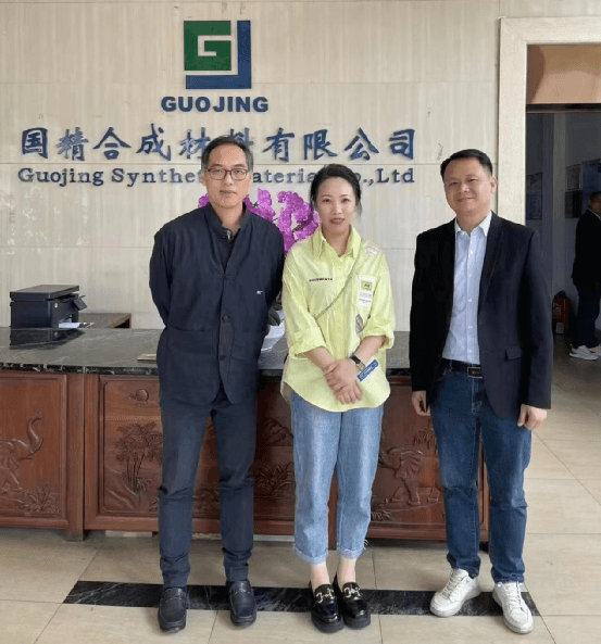 成都博高總經(jīng)理麥朝忠(右)、銷售總監(jiān)周志偉(左)與涂料采購網(wǎng)市場部經(jīng)理劉桐(中)合影