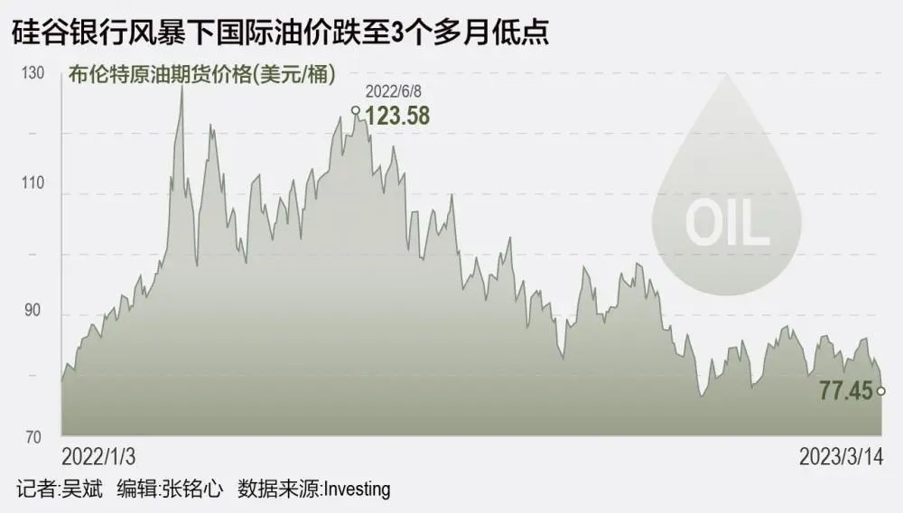 在硅谷銀行倒閉風暴、油市供應過剩等因素的沖擊下,國際油價遭受重挫。3月14日,國際油價大跌逾4%,創下三個多月新低,15日,WTI原油期貨盤中一度跌破70美元,創下14個月新低。16日,WTI 4月原油期貨收跌5.22%,盤中一度暴跌近8%,收報67.61美元/桶,自2021年12月以來即月合約首度收盤跌破70美元。布倫特5月原油期貨收跌4.85%,報73.69美元/桶,創2021年12月以來收盤新低。