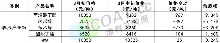 丙烯酸丁酯3月中旬9383元/噸,較3月初價格下跌967元/噸,跌幅9.34%;