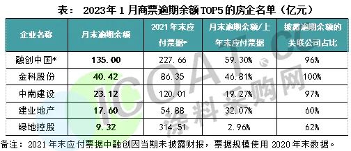 在今年1月TOP200梯隊(duì)的50家逾期房企集團(tuán)名單中,共涉及旗下804個項(xiàng)目公司發(fā)生商票未支付,金科商票逾期余額40.42億;中南旗下73個項(xiàng)目公司出現(xiàn)商票逾期,逾期余額23.1億;建業(yè)和綠地商票逾期余額分別17.6億和9.3億,都是前期高度依賴商票融資。