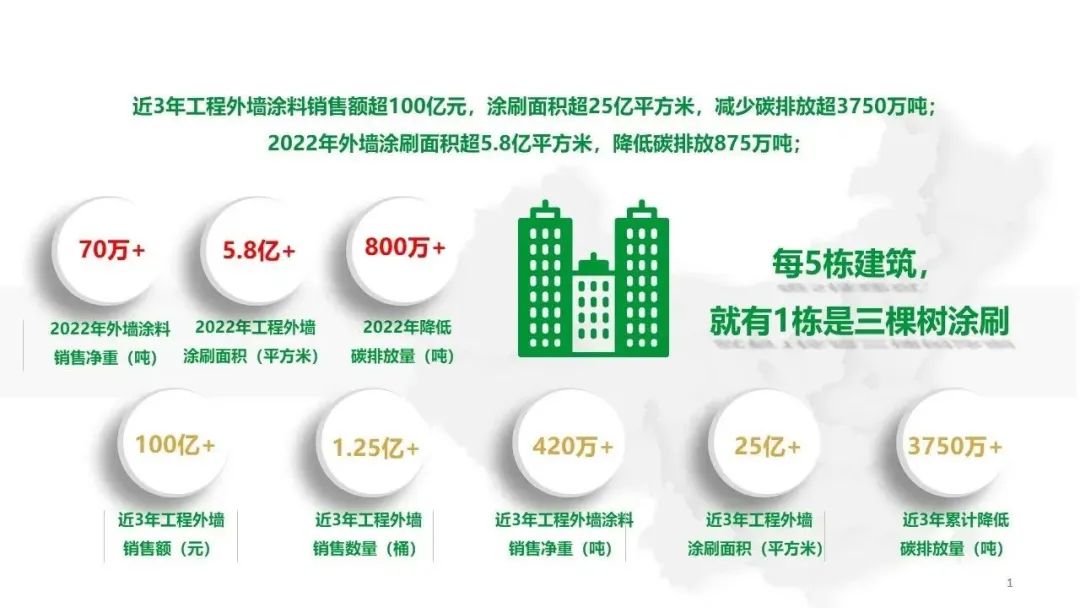 近3年,三棵樹工程外墻涂料銷售額超100億元,涂刷面積超25億平方米,減少碳排放3750萬噸。2022年工程外墻涂刷面積5.8億平方米,也就是說,每5棟建筑就有1棟是三棵樹涂刷的。