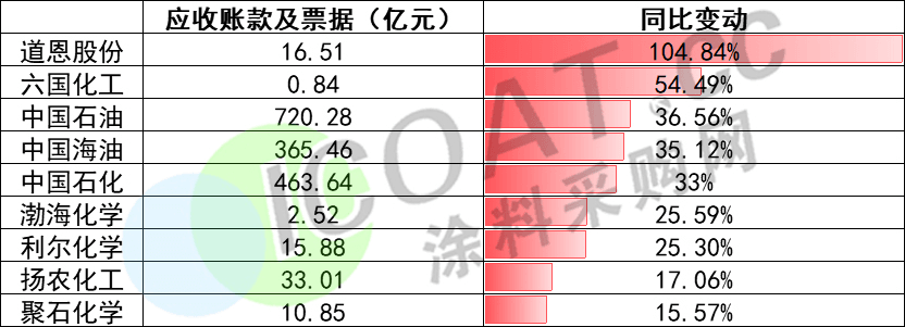 涂料采購(gòu)網(wǎng)查閱了部分化工企業(yè)2022年財(cái)報(bào)數(shù)據(jù),應(yīng)收票款方面數(shù)額巨大,中石油、中石化、中海油、中國(guó)化學(xué)等應(yīng)收票款超過(guò)百億,合計(jì)超過(guò)1600億。而在同比變化中,道恩股份應(yīng)收賬款及票據(jù)同比增長(zhǎng)超100%,六國(guó)化工同比增長(zhǎng)超50%,中石油、中海油等同比增長(zhǎng)也在10%以上,翻倍的數(shù)據(jù)能夠看出化工企業(yè)賒銷(xiāo)壓力強(qiáng)于2021年。