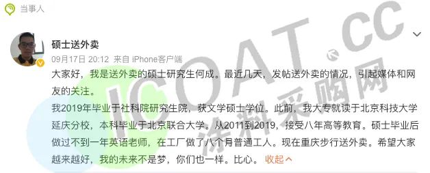 不久之前,一位畢業(yè)于中國(guó)社會(huì)科學(xué)院研究生院的碩士研究生送外賣(mài)的案例,引發(fā)了熱議。當(dāng)事人表示,畢業(yè)之后當(dāng)過(guò)一年的英語(yǔ)老師,還在工廠(chǎng)里打過(guò)工。但是一直“沒(méi)有找到合適的工作,需要養(yǎng)活自己”,無(wú)奈之下選擇送外賣(mài)。