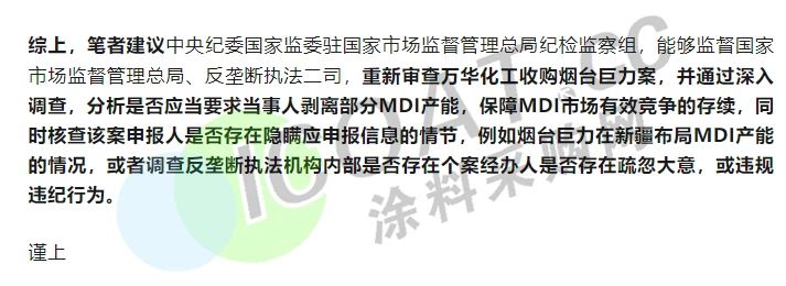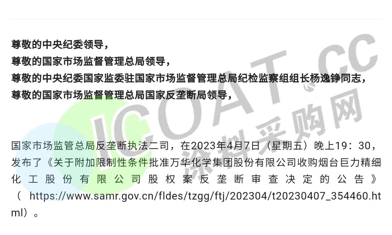 近日,某網友針對萬華化學收購煙臺巨力案件獲批一事,給中紀委,國家反壟斷局、國家市場監督管理總局協調處、國家市場監督管理總局反壟斷執法二司四部門發了一份建議信,要求對萬華化工收購煙臺巨力一案中是否存在隱瞞應申報信息、是否存在違規行為進行調查。