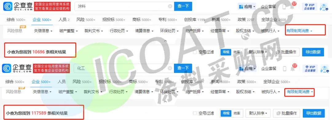 被限制高消費的涂料企業高管超過10000家,化工企業超過110000家。