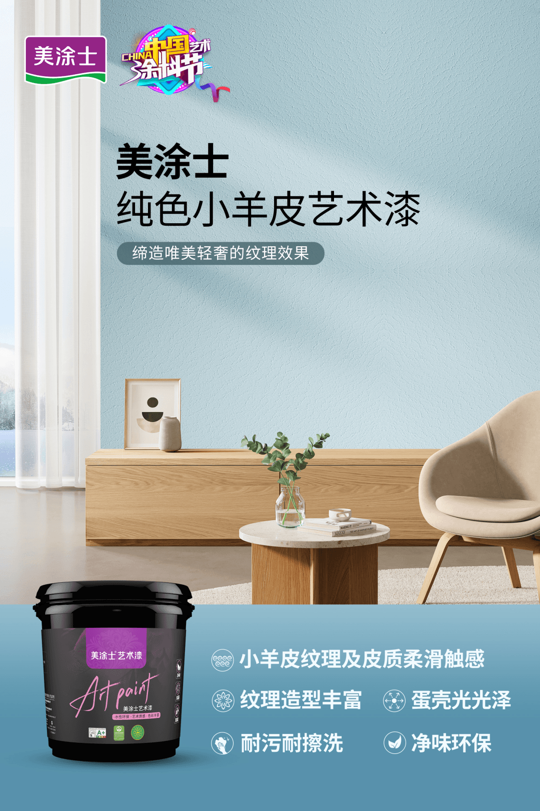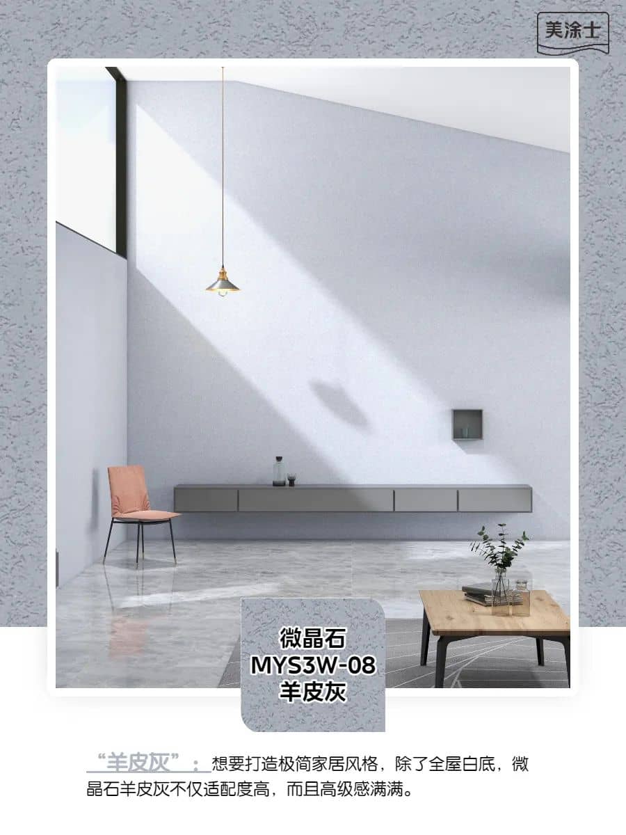 美涂士新品純色小羊皮藝術漆:皮質柔滑的手感,蛋殼般晶瑩的光澤。對于喜歡簡約清新的年輕人來說,純色背景墻搭配現代簡約風格再合適不過了,雖然看似簡單,但又是一種高級感的展現。美涂士純色小羊皮藝術漆,顏色純正亮麗,皮質柔滑的手感,在燈光下像水波一樣的漫射光澤,蛋殼般晶瑩光澤度觀感會顯得更加奢華。產品環保健康更通過嚴格的法國A+檢測,不止凈味,同時顏值在線、防霉在線、防潮在線,耐污在線等,滿足不同功能需求。