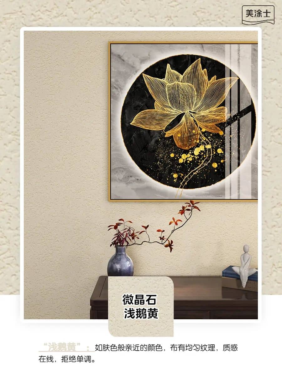 美涂士經典微晶石藝術漆:巖石質感,立體紋理。在繁忙的都市當中,家應該是每個人心底溫柔的部分,而美涂士微晶石藝術漆涂刷出來的簡約風格就能讓你回到家的那刻,卸去外面的浮躁與欲望,讓心靜下來。該產品擁有立體巖石質感,像是承載著文明積淀之美的大地,展現富有歲月底蘊的質感,擁抱生活帶來的美好。當其與實木家具架契合,加以綠植、裝飾畫、燈飾等元素相點綴,不需多用力即讓空間實現返璞歸真,還居室一份寧靜,打造出人與自然的和諧意境。同時在產品配方研發以及生產過程中未人為添加甲醛、苯以及其他揮發性有機化合物(voc),并搭載美涂士360抗甲醛技術,成品能有效吸附并分解室內空氣中的游離甲醛。