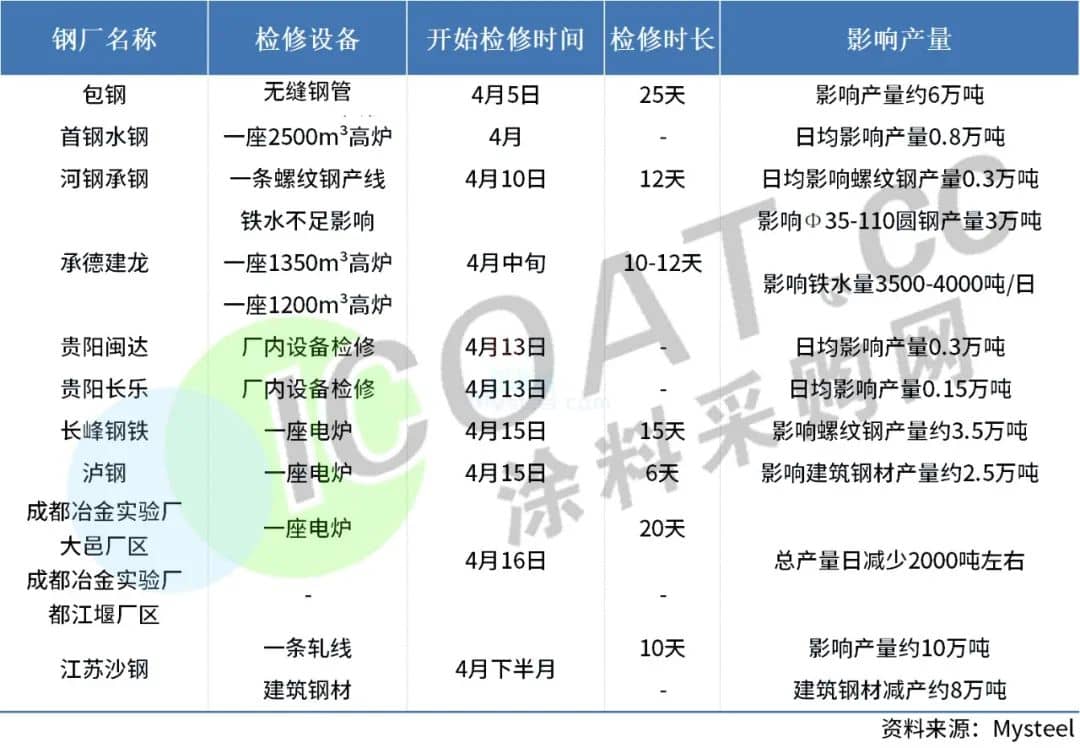 首鋼遷安4月中旬起檢修一座2650m高爐,日均影響鐵水量約0.67萬噸,預(yù)計檢修35天;