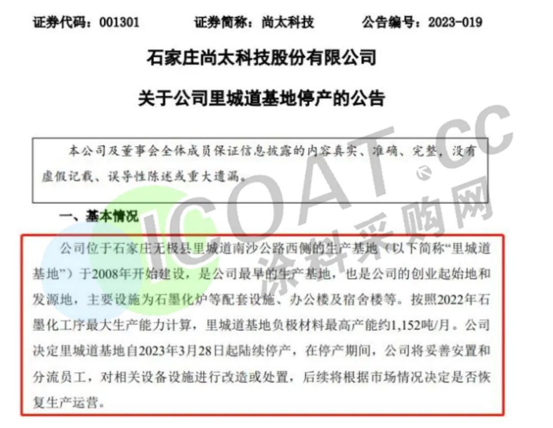 鋰電負(fù)極材料國內(nèi)市占率前五的尚太科技稱,公司決定里城道基地自2023年3月28日起陸續(xù)停產(chǎn),在停產(chǎn)期間,公司將妥善安置和分流員工,對相關(guān)設(shè)備設(shè)施進行改造或處置,后續(xù)將根據(jù)市場情況決定是否恢復(fù)生產(chǎn)運營。