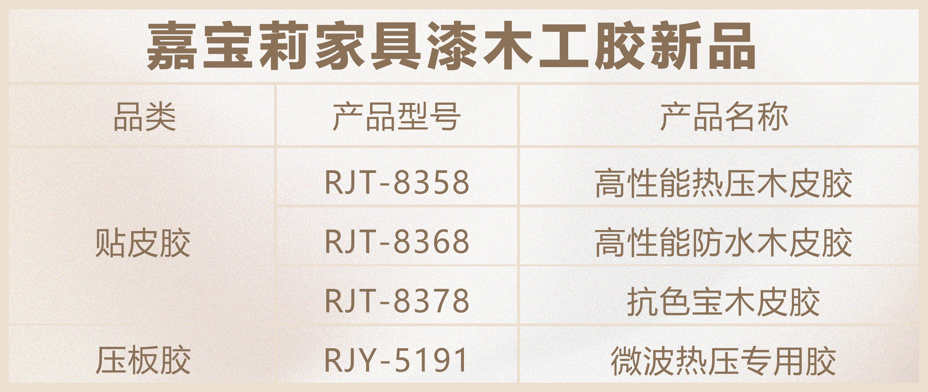 以上4個木工膠新品已在全國多個知名家居工廠落地應用,反饋良好。嘉寶莉木工膠,歡迎您來電咨詢400-168-2227,為您在家居生產用膠提供更好的解決方案!