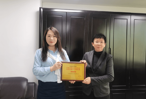 涂料采購網江雪(左)為壹維機電總經理謝紅輝(右)頒發十大供應商牌匾