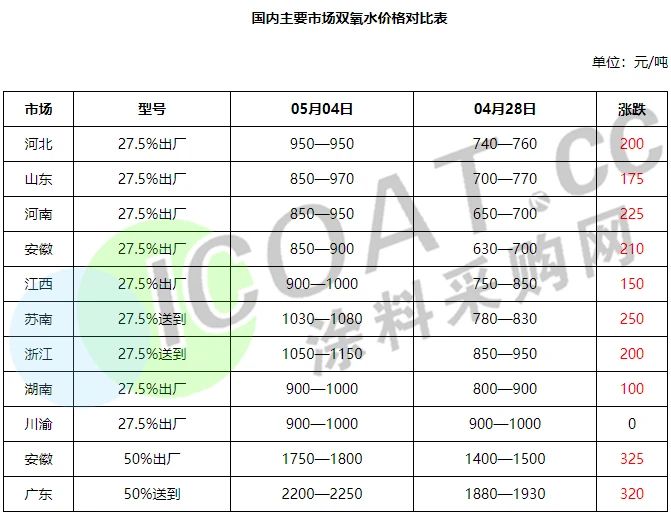 山東濱化東瑞27.5%雙氧水出廠漲30元/噸;山東新龍化工、山東恒通、河北田原化工27.5%雙氧水出廠漲50元/噸;德州實華化工27.5%雙氧水出廠漲50元/噸,50%雙氧水出廠漲100元/噸;山東華泰27.5%雙氧水出廠漲40元/噸,50%雙氧水出廠漲130元/噸。
