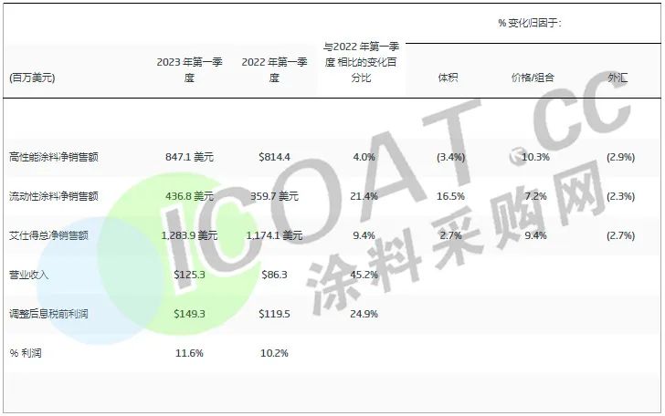 PPG一季度實現創紀錄的凈銷售額43.8億美元(約合人民幣302億元),同比增長2%;凈利潤暴增1367%至2.64億美元(約合人民幣18億元);在銷售價格上漲的帶動下,企業有機銷售額較上年增長5%以上。供應中斷緩解,生產經營改善,經營性現金流同比增長約4億美元(約合人民幣27億元)。