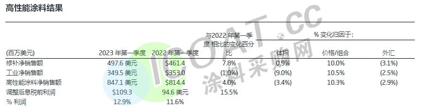 一季度艾仕得高性能涂料凈銷售額同比增長4.0%至8.471億美元(約合人民幣58億元),這得益于新業務的贏得、市場復蘇以及兩個終端市場實現價格的上漲。修補漆凈銷售額同比增長7.8%至4.976億美元(約合人民幣34億元),主要受價格組合增長10.0%的推動。