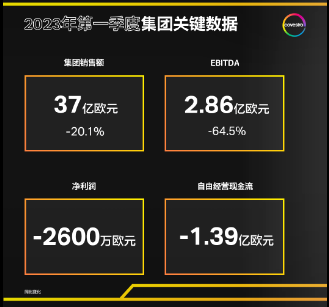 2023年第一季度,主要受銷量和銷售價格下滑影響,科思創集團銷售額同比下降20.1%至37億歐元(約合人民幣281億元),息稅折舊攤銷前利潤(EBITDA)受銷量和利潤率下降影響,同比降低64.5%至2.86億歐元(約合人民幣21億元),但遠超企業和市場預期。