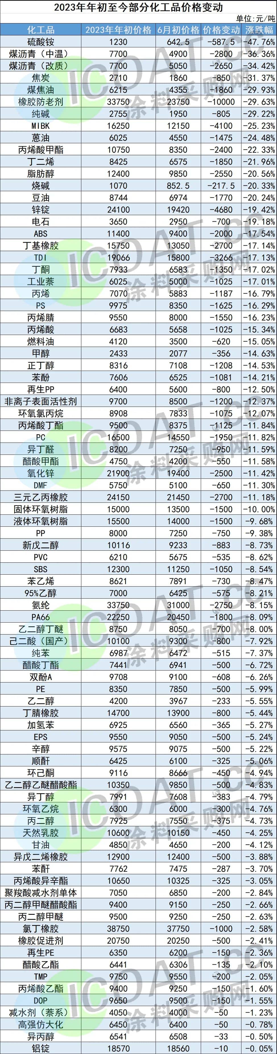 據涂料采購網信息中心數據,自年初以來,100多種化工原材料價格下滑,其中硫酸銨跌幅為47.76%,幾乎腰斬;煤瀝青、MIBK、丙烯酸甲酯、TDI、ABS等原材料噸價下跌超過千元。