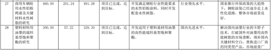 另有部分項目在2022年完成階段性進程,商用車鋼輪用水性鋁粉烤漆及關鍵材料水性樹脂、塑料材料用油墨的端羥基型飽和聚酯、TGIC 體系超耐候抗反沖粉末涂料用聚酯樹脂項目已完成,達到目標并處于行業或國內領先水平。低溫固化粉末涂料用新型聚集態結構聚酯樹脂的合成項目結果正在進行驗證推廣。汽車GLL全系列環保涂料及全產業鏈關鍵樹脂材料項目產品已完成小批量生產。