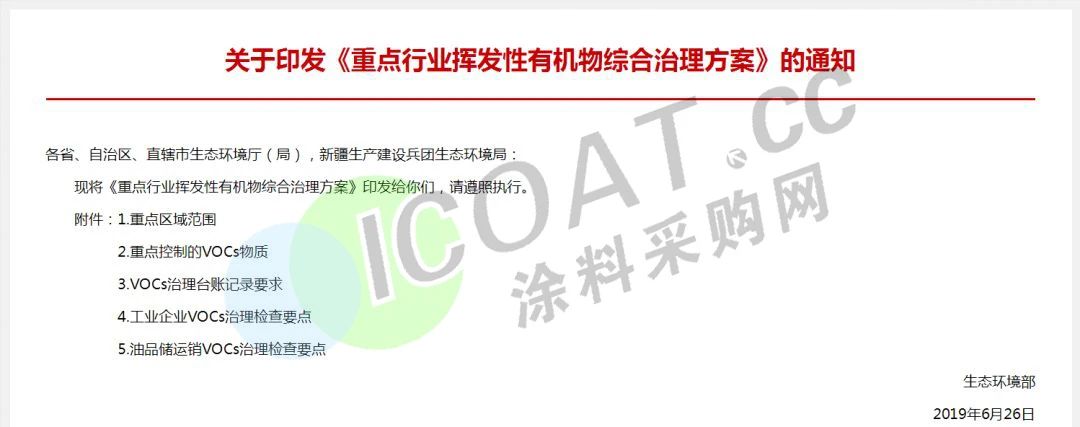 2019年6月,生態環境部發布關于印發《重點行業揮發性有機物綜合治理方案》的通知,要求到2020年,建立健全VOCs污染防治管理體系,重點區域、重點行業VOCs治理取得明顯成效,完成“十三五”規劃確定的VOCs排放量下降10%的目標任務。