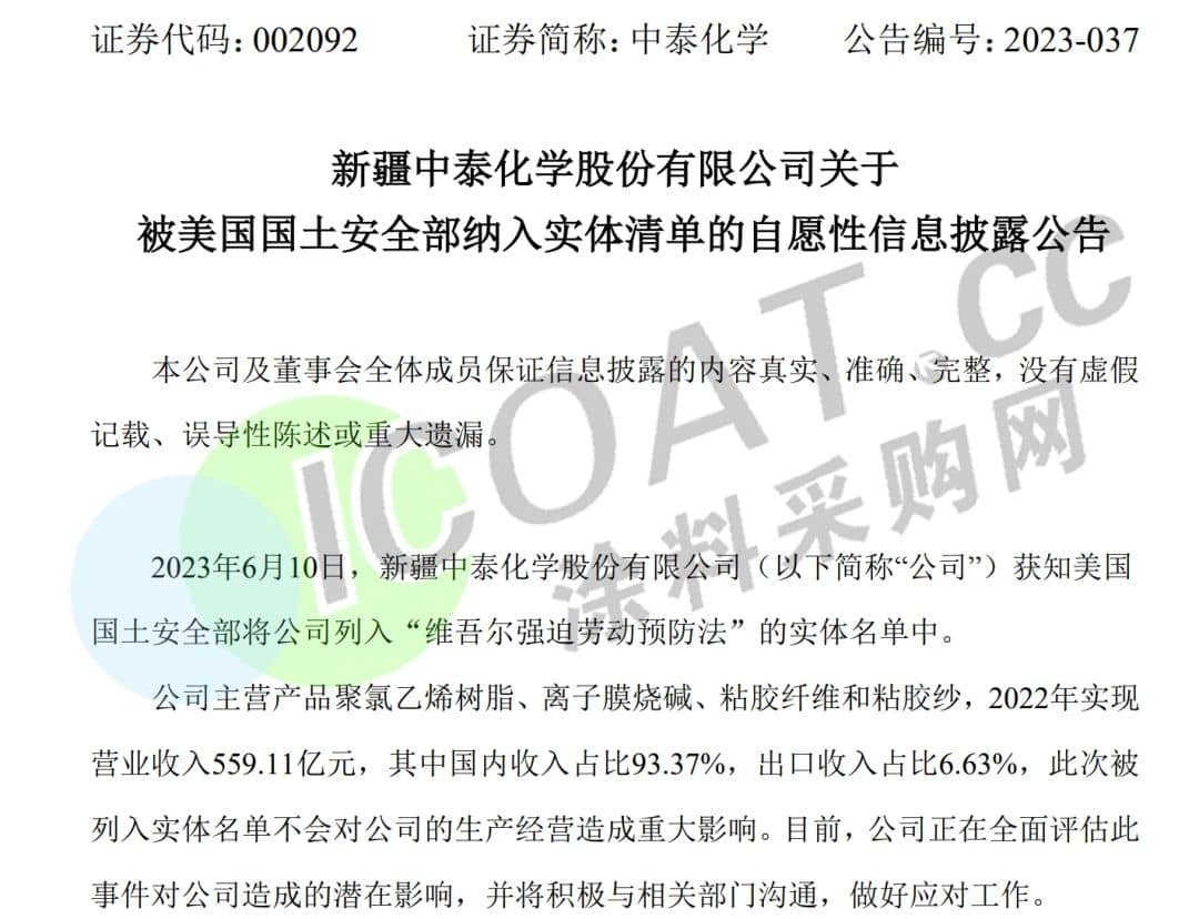中泰化學發布隨后發布了《關于被美國國土安全部納入實體清單的自愿性信息披露公告》,稱公司主營產品聚氯乙烯樹脂(PVC)、離子膜燒堿、粘膠纖維和粘膠紗,2022年實現營業收入559.11億元,其中國內收入占比93.37%,出口收入占比6.63%。