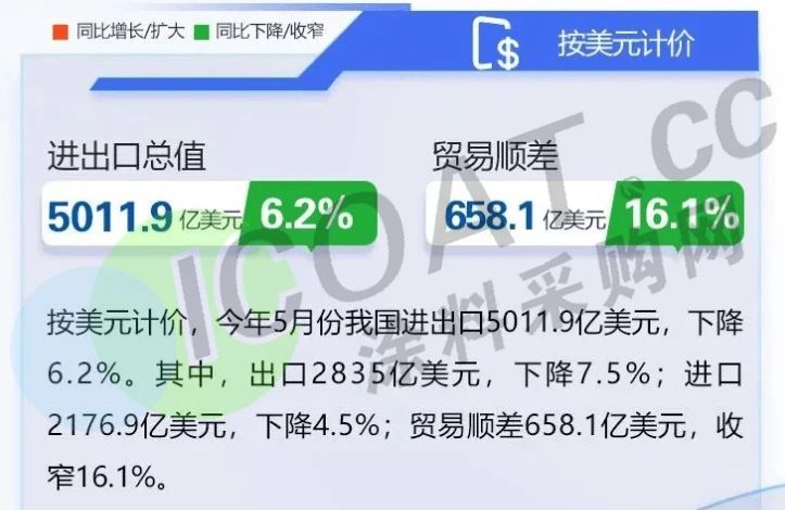 事實(shí)上,光伏行業(yè)的出口受到壓制只是近期國(guó)內(nèi)外貿(mào)行業(yè)的一個(gè)縮影,多方的制裁和約束,也讓國(guó)內(nèi)的外貿(mào)企業(yè)走入更深的困境。據(jù)海關(guān)統(tǒng)計(jì),今年5月份,我國(guó)進(jìn)出口3.45萬(wàn)億元,增長(zhǎng)0.5%。其中,出口1.95萬(wàn)億元,下降0.8%;按美元計(jì)價(jià),今年5月份我國(guó)進(jìn)出口5011.9億美元,下降6.2%。其中,出口2835億美元,下降7.5%。貿(mào)易順差658.1億美元,收窄16.1%。