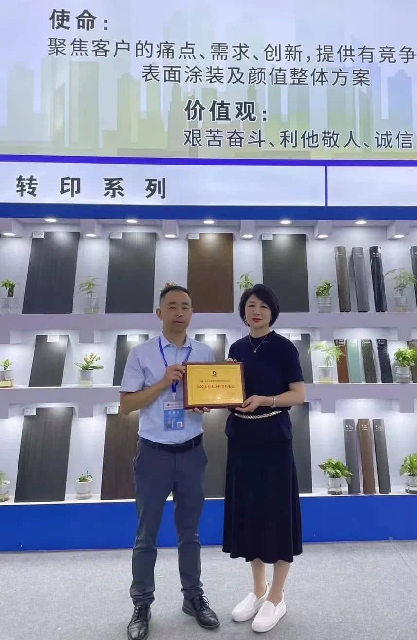 涂料采購網張馨元(右)為浙江興順楊總(左)頒發2022年粉末涂料百強獎牌