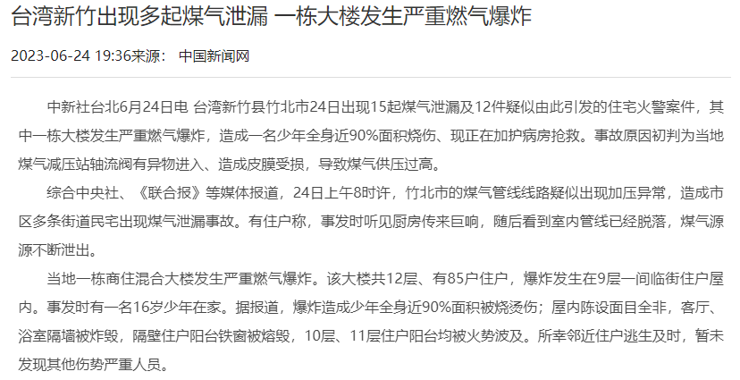 6月24日,臺灣新竹縣竹北市出現(xiàn)15起煤氣泄漏及12件疑似由此引發(fā)的住宅火警案件,其中一棟大樓發(fā)生嚴(yán)重燃?xì)獗ǎ斐梢幻倌耆斫?0%面積燒傷、現(xiàn)正在加護(hù)病房搶救。事故原因初判為當(dāng)?shù)孛簹鉁p壓站軸流閥有異物進(jìn)入、造成皮膜受損,導(dǎo)致煤氣供壓過高,周邊上百住戶緊急疏散。