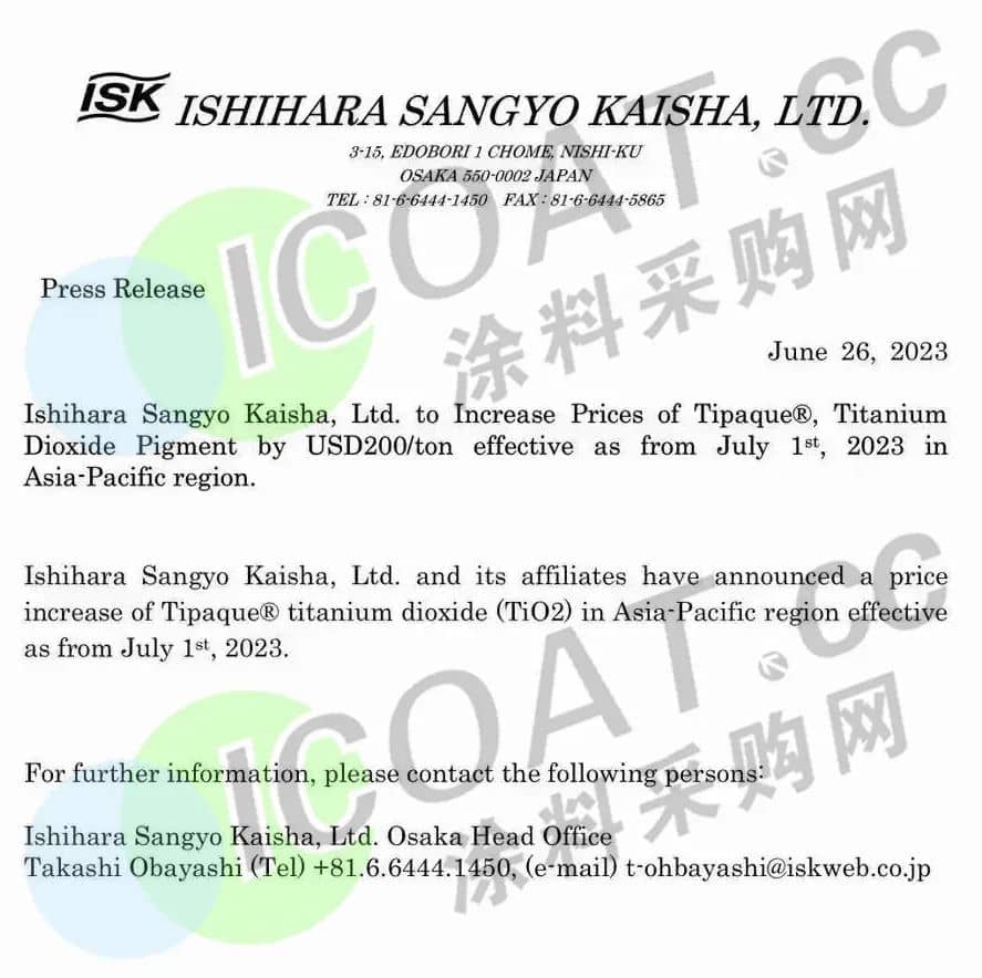 近日,日本石原ISK發(fā)布漲價函,稱7月1日起,鈦白粉在亞太地區(qū)價格將上調(diào)200美元/噸。