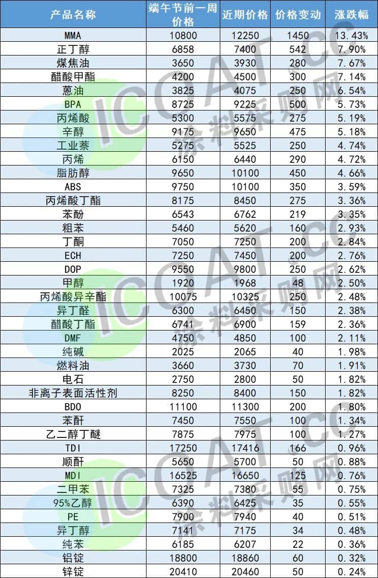 涂料采購網(wǎng)信息中心數(shù)據(jù)顯示,40多種化工品價格較半個月前(端午前一周)報(bào)價有所上調(diào),但幅度普遍較小,其中MMA小漲13%。