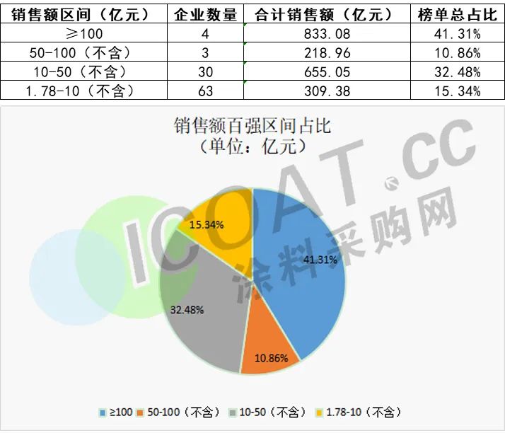 從銷售額情況來看,2022年銷售額TOP100涂料企業合計銷售額達到2016.47億元,同比去年數據增長了約5%。其中銷售額在100億元以上、50億元-100億元(不含)的企業分別有4家、3家,合計銷售額占100強總銷售額的41.31%、10.86%。10億元-50億元(不含)、1.78億元-10億元(不含)的企業分別為30家和63家,占比為32.48%和15.34%。