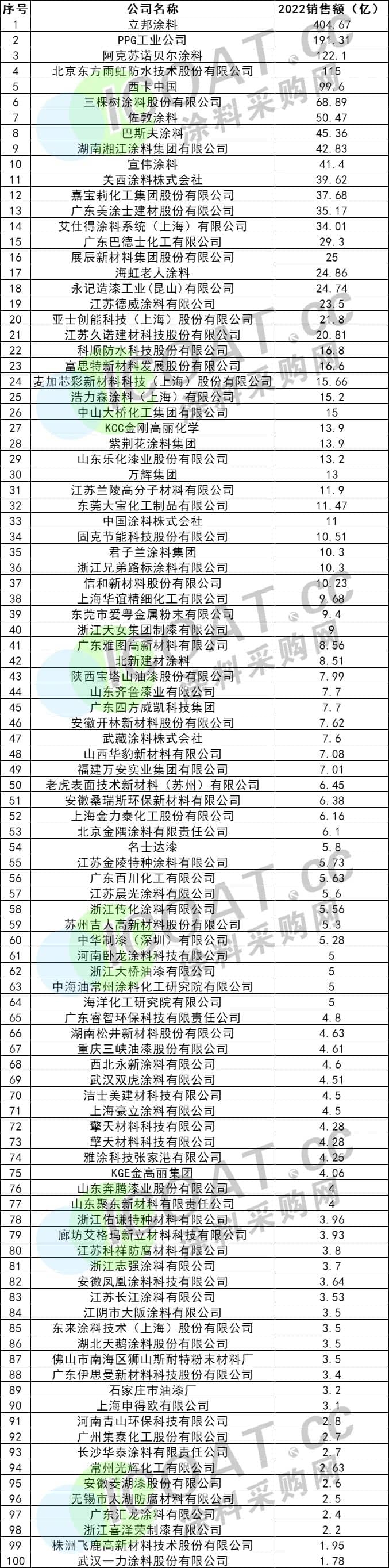 立邦涂料、PPG工業公司、阿克蘇諾貝爾涂料這三家涂料企業位居冠亞季軍位置,2022年銷售額分別為404.67億元、191.31億元、122.1億元,且已經蟬聯三年。值得注意的是,TOP10中,除了三家外資企業,東方雨虹是唯一一家銷售額超過100億的民族涂料企業。