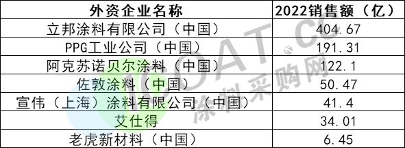 在銷售額100強中,僅7家外資涂料企業上榜,分別為阿克蘇諾貝爾涂料(中國)、艾仕得、立邦涂料有限公司(中國)、老虎新材料(中國)、PPG工業公司(中國)、宣偉(上海)涂料有限公司(中國)、佐敦涂料(中國),合計銷售額為850.41億元,占TOP100涂料企業總產量的42%。這也就意味著,民族涂料企業在100強銷售額中占比約為58%,即將突破6成。