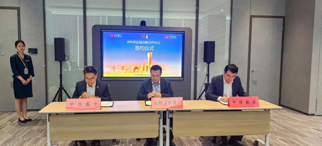 繼涂料采購網聯合戴卡成功舉辦第二屆涂料涂裝供應鏈交流大會之后,2023年7月11日,在中信戴卡、立邦中國和中信鈦業三方全面推動,以及中信集團業務協同部協同促進下,戴卡、立邦和鈦業三方集聚北京中信大廈,舉行“涂料領域供應鏈戰略合作協議”簽約儀式。集團協同部、中信戴卡、中信鈦業、立邦中國相關領導及業務人員參加會議。