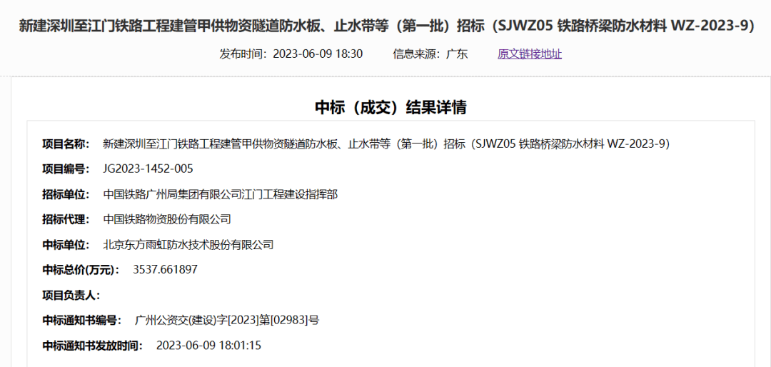 中標新建深圳至江門鐵路工程建管甲供物資隧道防水板、止水帶等(第一批)招標(SJWZ06鐵路橋梁防水材料WZ-2023-9)。