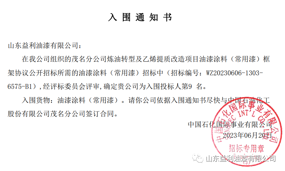 成功入圍中國石油化工股份有限公司茂名分公司煉油轉型及乙烯提質改造項目油漆涂料(常用漆)框架協議。