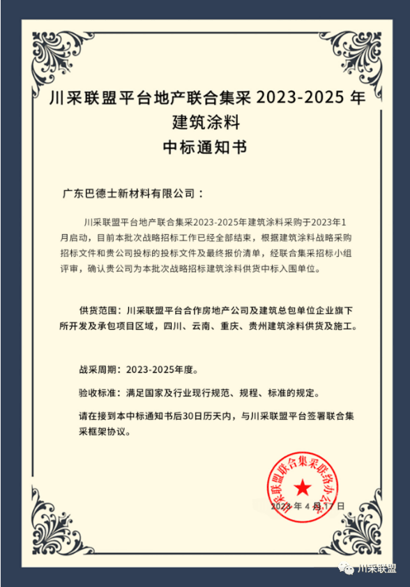 廣東德普威涂料有限公司、廣東巴德士新材料有限公司中標入圍川采聯盟平臺第三十二批次地產聯合集采建筑涂料戰略采購。