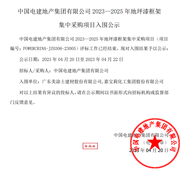 廣東美涂士建材股份有限公司、嘉寶莉化工集團股份有限公司入圍中國電建地產集團有限公司公布了2023-2025年地坪漆框架集中采購項目入圍名單。