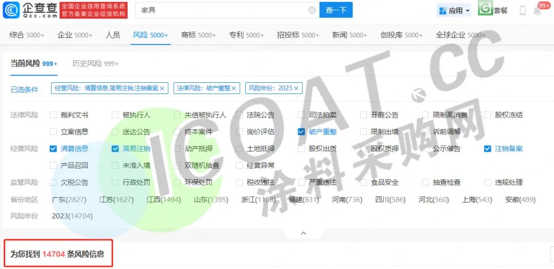 家具行業:破產、清算、注銷14704 家,包括家具廠、木藝家具、櫥柜加工、全屋定制、家居裝飾等多個細分領域。